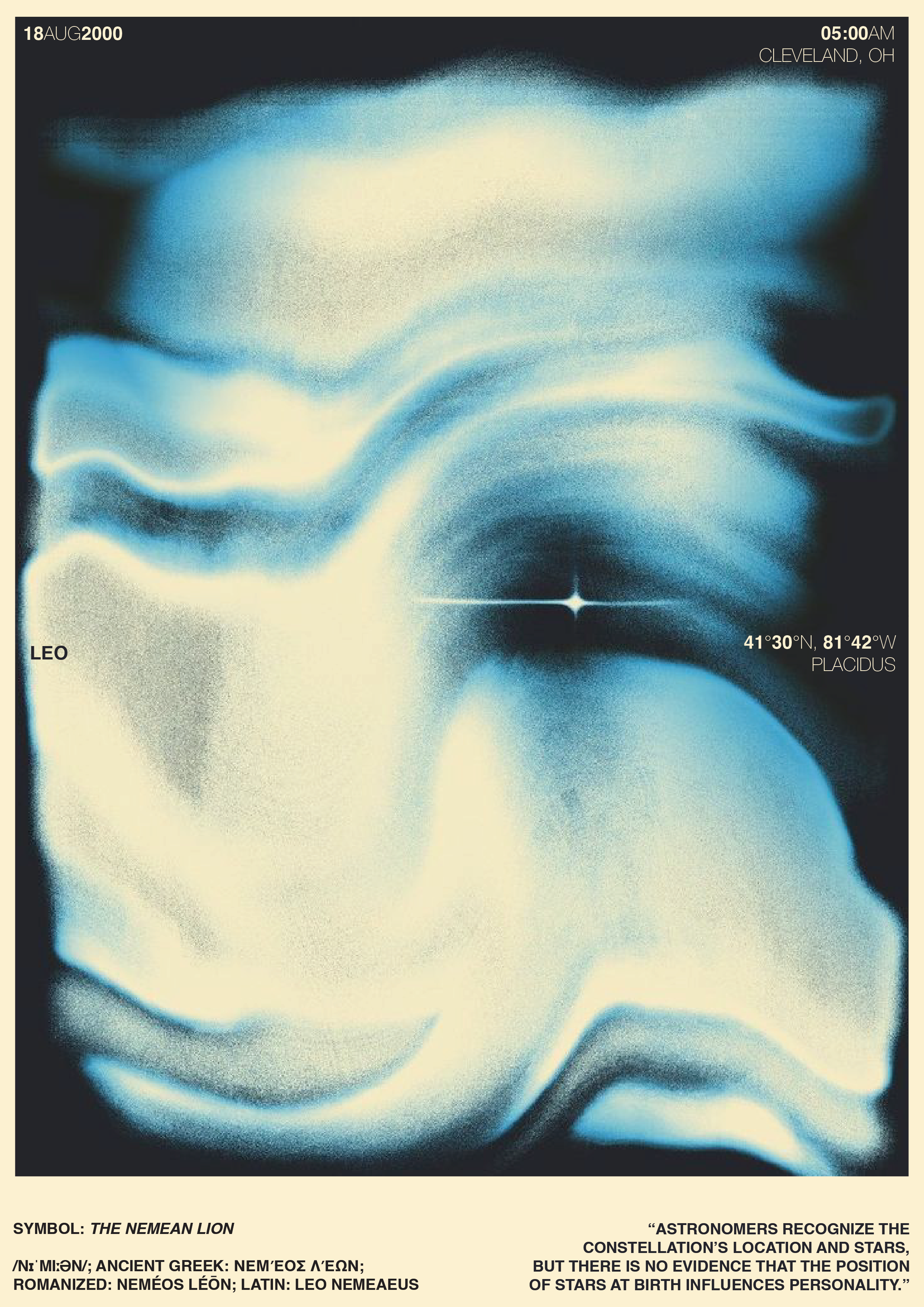 My chart heavily emphasizes the Sun and Ascendant placements in Leo. I used this astrological data to create a contemporary editorial poster borrowing inspiration from Swiss typographic styles.